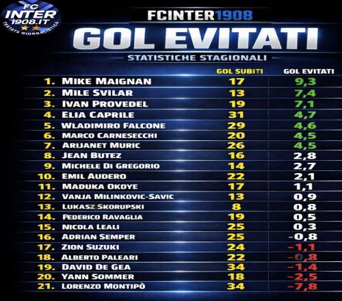 意甲门将阻止预期进球榜:迈尼昂9.3第一,索默2.5倒数第二