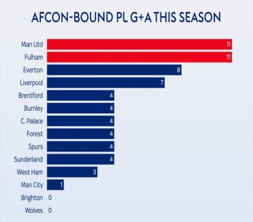 富勒姆和曼联位列第二与第三,这两支球队被征召的球员在英超中出场时间都超过3000分钟。相较之下,曼联受影响要比富勒姆大,因为他们被征召的都是核心“大腿”,一位是新援姆贝乌莫,本赛季这位喀麦隆前锋在联赛出场1404分钟,有6粒进球入账。另一位是科特迪瓦边锋阿马德·迪亚洛,本赛季至今,他攻入2球还送出2次助攻。第三位是摩洛哥后卫马兹拉维。据德转统计,本届非洲杯英超球队参赛球员总身价榜,曼联这三人以1.47亿欧元排在首位。