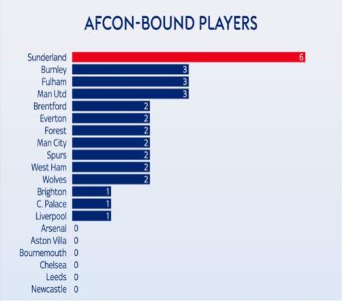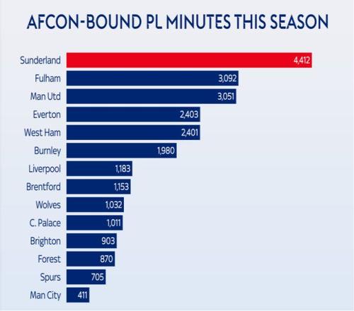 被征召的球员多是一回事,被征召的是重要球员又是另一回事。就参加非洲杯的球员上场时间而言,桑德兰再次成为受影响最大的球队。