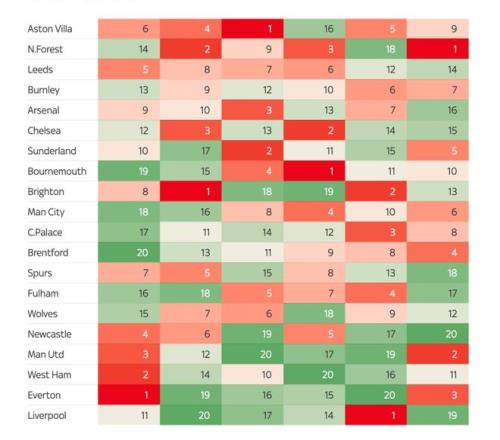 最后再来看一下,在接下去的一个月时间内,根据对手的联赛排名,英国媒体对各俱乐部接下来六场英超的赛程进行的难易度评估。