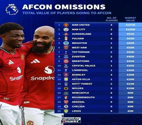 2025非洲杯本周末将拉开帷幕,参加这届赛事的英超球员已经前往各自的国家队报到,被征召的球员最多可能缺席一个多月。那么,哪些英超俱乐部受到的影响最大,哪些俱乐部受到的影响最小呢?