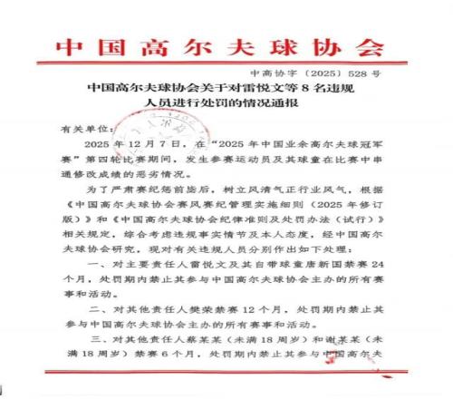 12月19报道 中国高尔夫球协会发布情况通报,在“2025年中国业余高尔夫球冠军赛”第四轮比赛期间,发生参赛运动员及其球童在比赛中串通修改成绩的恶劣情况,对涉事人员处以最高禁赛2年的处罚。