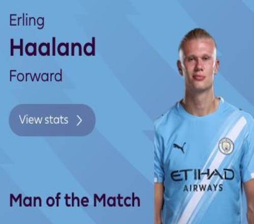 梅开二度,哈兰德当选曼城vs西汉姆联全场最佳球员