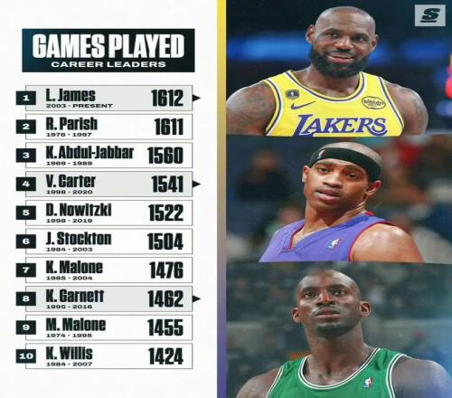 常规赛出场数达1612场,独享历史第1