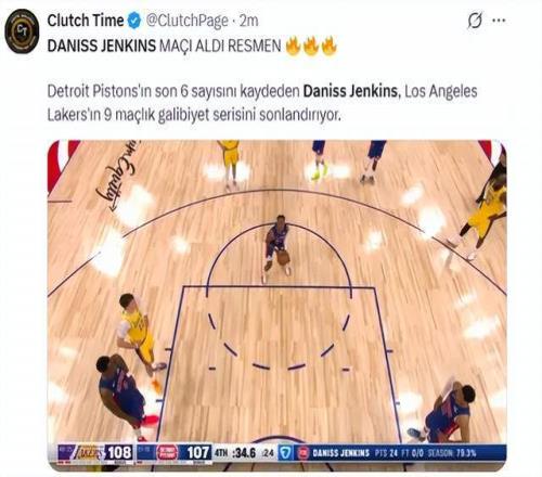 短短25秒时间里,詹金斯一人拿下关键6分,硬生生把比赛从湖人手中抢了回来。而反观湖人一方,最后12秒东契奇急停中投失手,最后一攻的绝平三分更是直接三不沾。对比两队关键时刻的表现,活塞取胜也就不难理解了。